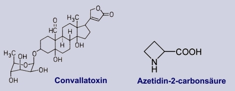 2. Convallariae herba - Wirkstoffe sind herzwirksame Steroidglykoside (etwa 40 Cardenolide bis zu 0.5 %), vor allem Convallotoxin, Convallotoxol, Convallosid, Lokundjosid, Desglucocheirotoxin; Steroid-saponine, Flavonoide. Gefunden wurde auch Azetidin-2-carbonsäure (toxische Aminosäure), Chelidonsäure und Cholin.