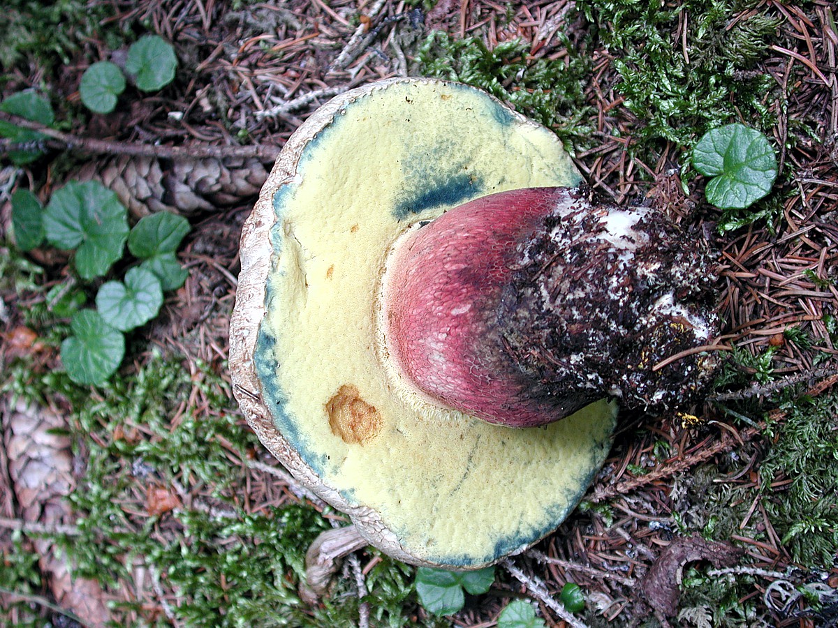 Das Fleisch ist weisslich bis blass gelblich gefärbt und läuft im Schnitt sofort schwach blaugrünlich an.